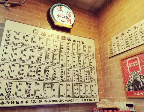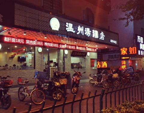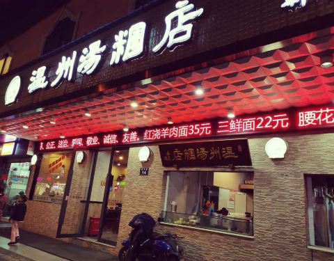 [环境]温州汤团店,“屹立”于新华路14号。在这条老字号餐饮店荟萃的新华路,已有20年的店龄,经久不衰的生意,精湛的厨艺技术,过硬的实力,极高的性价比,打败网红店无数,独占鳌头,成为老店中的“网红”,大...[环境]温州汤团店,“屹立”于新华路14号。在这条老字号餐饮店荟萃的新华路,已有20年的店龄,经久不衰的生意,精湛的厨艺技术,过硬的实力,极高的性价比,打败网红店无数,独占鳌头,成为老店中的“网红”,大名鼎鼎却也依然从容低调。老店就像一坛黄酒,历经岁月流逝,历久弥新,越陈越香。 24小时营业的温州汤团店,夜深人静,雨点纷飞,倾盆大雨将至,它如回家路上一盏明亮的灯,也是深夜食堂,提醒你不妨吃碗面,避避雨吧。 店内环境简单整洁,曾有细微修缮,墙上贴有“请勿浪费”诸如此类文艺标语,也设有放置手机的塑料架,人性化现代化服务,感谢依然保留了老字号的原汁原貌,复古情怀在这里四处安放。 [服务]店里的几个阿姨都是许许多多年的老员工了,她们的脸似乎印刻在周围居民脑海里了。菜品端出厨房,她们就会大声呼喊菜名,直到顾客摆摆手,端到顾客桌上。这种“呐喊”式的上菜服务多年延续,习惯于这种近乎亲切的真实。这或许也是老店的“本色”吧。 |青菜笋干面^一碗素面,13元。满满一大碗新鲜出炉,热气腾腾飘着热气,猪油香味扑鼻,青菜切的薄薄的,笋干切的细细的,且放足鲜嫩的笋尖,面条细长且柔韧,笋尖、青菜、猪油搭配熬制,一碗汤面的精髓在于汤底,一种跨越20年,千锤百炼,不改初心的本土味道。 雨夜吃起这碗面,20年往事,点滴如碎片,在脑海浮现,在眼前闪烁,又如蝴蝶般翩翩而过。20年前,10年前,5年前,1年前,我都在温州汤团店吃面,而故人和旧事早已消逝而去,无从追忆。 回忆的转角处,只留下一碗青菜笋干面,温州汤团店里思流年。