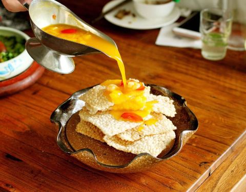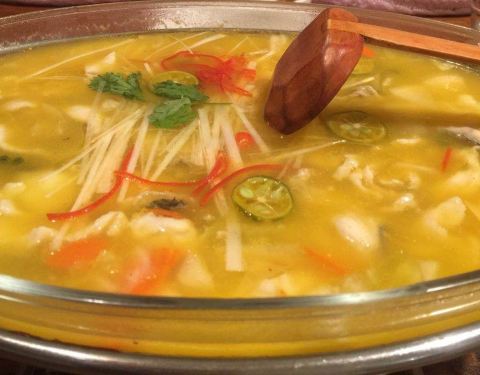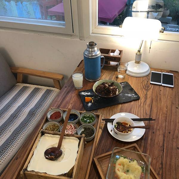 拾年主题庭院餐厅是一幢类似民居的小别墅,外面有露天位,里面的环境具有小资情调。餐厅做的是创意菜,人气一直很旺,招牌拾年私房鱼用酸汤做底,比较开胃;拾年土豆泥做得很细腻,里面混合了青豆、胡萝卜丁;桂花营养米汤装在复古的热水瓶里,甜甜的滋味带来满满的幸福感。