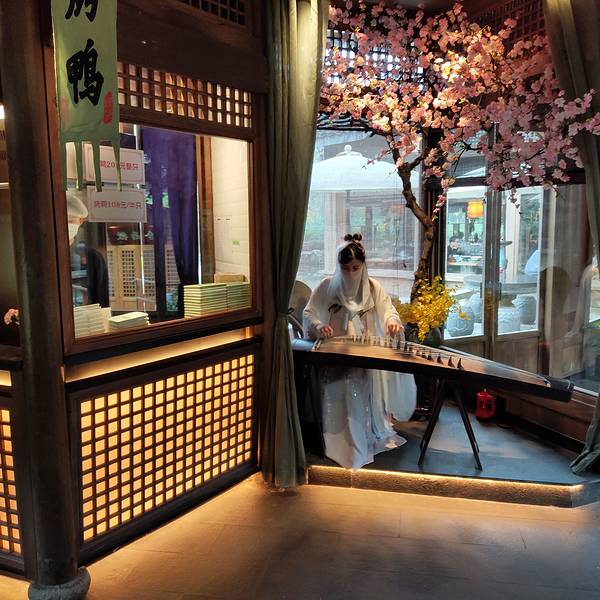 - 室内一派江南庭院风格,还有歌女轻轻弹奏着江南曲调,让品尝佳肴也充满了诗情画意