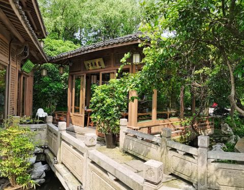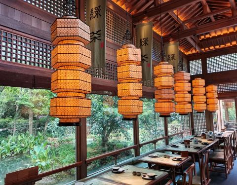 午餐来到了位于西湖畔龙井路的绿茶总店。这家开在茶园里的餐厅,曾经是一家青年旅舍,如今发展成为了全国性的连锁餐饮。室内一派江南庭院风格,还有歌女轻轻弹奏着江南曲调,让品尝佳肴也充满了诗情画意。店里主打改良版杭帮菜,招牌菜都融入了绿茶的元素,如:绿茶葱香烤肉、龙井凤尾虾仁等。