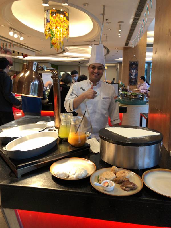 前几年五星级酒店很少的时候,这里算是很不错的高端酒店了。自助餐也很有名的。装修很赞。现在五星级酒店越来越多了呢。活动也比较多。这边自助也开始办什么特别节。印度风。有点舞蹈还是比较助兴的呢。印度飞饼的师傅比较可爱。