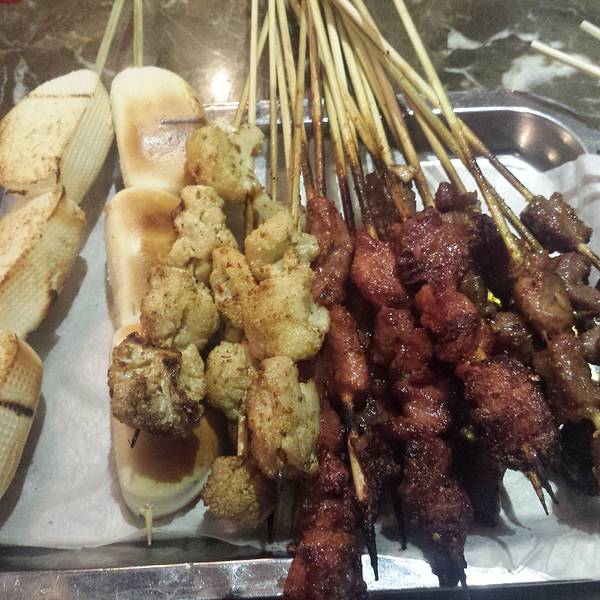 各种烤串,非常齐全,牛羊肉串,烤鸡翅,牛筋,生蚝,金针菇,鱿鱼,各种蔬菜。味道不错,价格实惠。