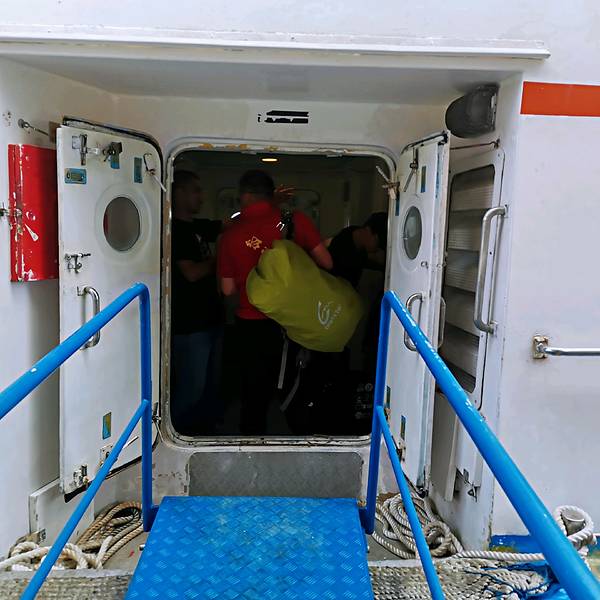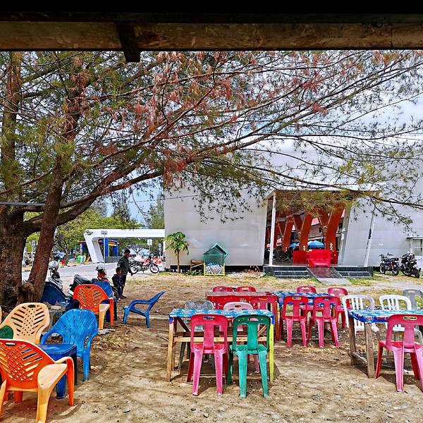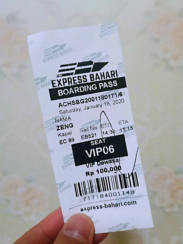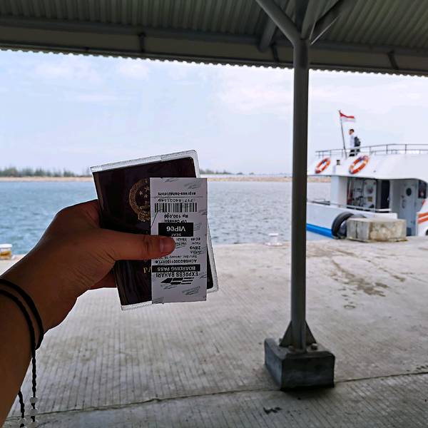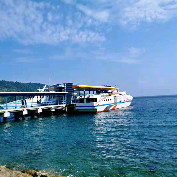 大概50分钟的样子,我们就到了码头,时间大概是12点半,问了一下还有快船,就去吃了个饭。 之前看网上的攻略,说下午4点才有快船,但是我们去的时候2点半就有一趟。 去韦岛有快船和慢船的分别,快船大概1个小时就到了。慢船大概2-3个小时,价格差不多。快船是8万印尼盾,VIP舱的话是10万印尼盾。折合人名币大概人均50元。我们为了体验一下VIP,就买的贵的。 给大家普及一下往返轮船的时刻表。 班达亚齐——韦岛 早上10点(快船)和早上11点(慢船,逢每周三,六,日) 下午2点(慢船,逢每周一,二,五日)和下午4点(快船) (Ps:我们是坐的下午2点半的快船) 韦岛——班达亚齐 早上8点(快,慢都有) 下午1点半(慢船,逢每周三,日,六)和下午2点半(快船) 慢船的价格比快船便宜一半,但是不推荐,太慢了。码头候船大厅码头旁边没有什么玩的,不过有海滩。 附近吃的也很少,外面就只看到了两家,我们怀着试一试的态度随便去了一家。 结果真的太脏了,完全吃不下。原本以为印度尼西亚的吃的都是这样,还好只是码头,不然真的要瘦个几十斤了。餐厅门口,前面白色的大厅就是候船厅。下午2点准时登船。船票长这样登船啦!韦岛码头航程大概一个小时,2点半准时出发,3点半准时到达。 码头和飞机场一样,一下船。各种司机扑面而来,老规矩,大家照一个顺眼的人问问价格吧,记得砍价。 我们因为人太多,就包的一个车。3个人的话,可以坐突突车,便宜不说,还可以看风景。 我们打车的价格从35万砍到了18万,大概走遍全岛也是这个价格了。人均15元人名币左右,车程大概40分钟。 (备注一下,如果晕船的话,一定要带好晕船药,这个船真的开的太快了,硬生生的把我这个不晕船的人搞吐了)