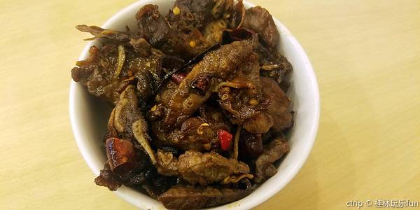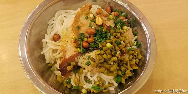 桂林米粉是特色,崇山米粉更是久负盛名,味道怎么说呢,可能是不太适合这种口味,味道淡,但偏辣、偏酸。总的来说,当地的特色一般适合外地人的不多。