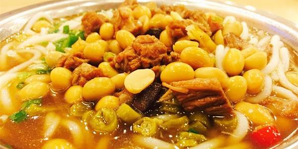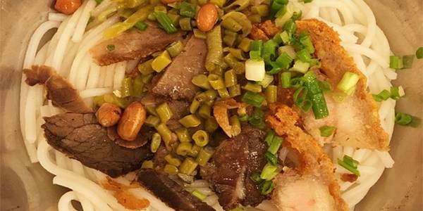 桂林米粉是比较有名的,崇善米粉算是小有名气的一家店。他们家的米粉弹性十足,舀一小勺他们家祖传的卤水,配上锅烧,放上酸豆角、花生米。