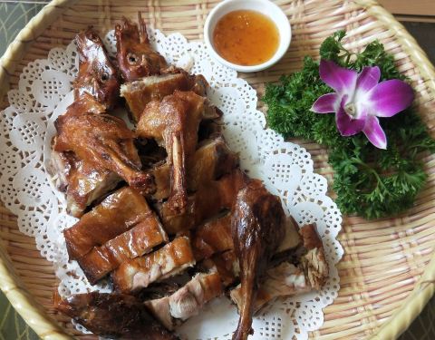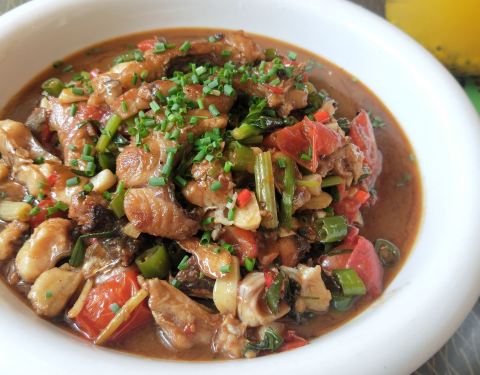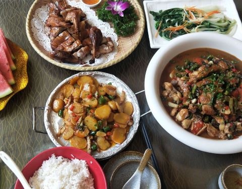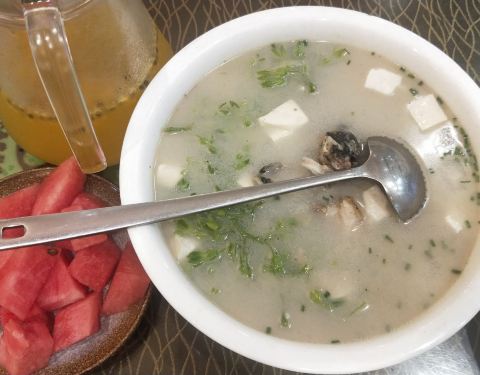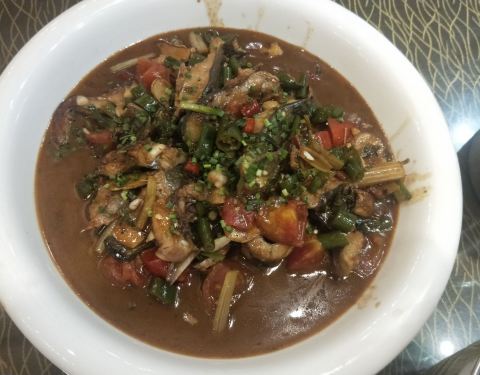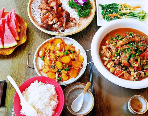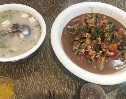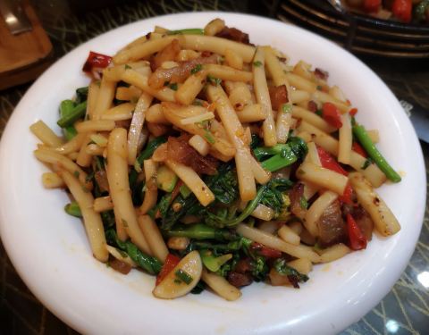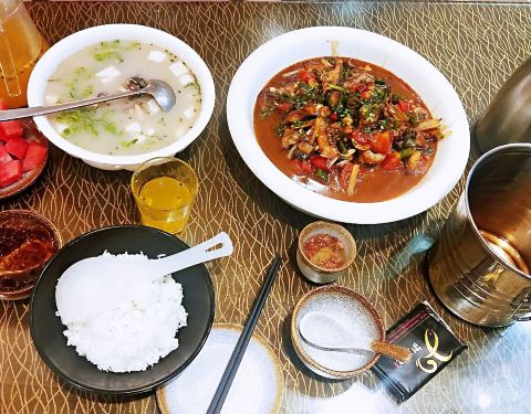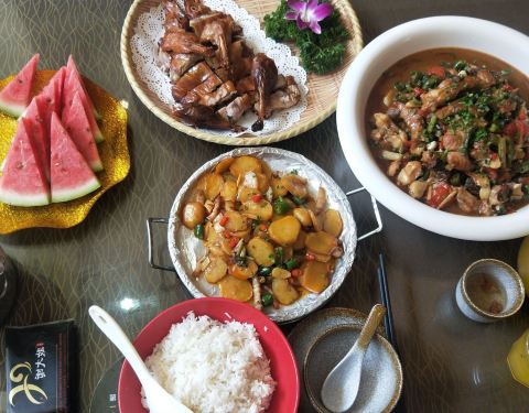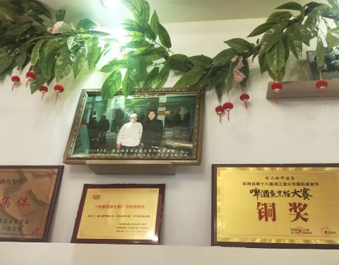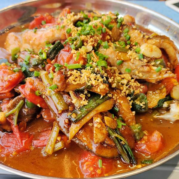 在西街满满的做啤酒鱼的店里,这家名气很响。鱼有多种选择,草鱼、剑齿鱼都可以。鱼肉鲜嫩,鱼汤口味较重,味道吃起来特别有层次。苦瓜酿也很不错,多尝尝当地特色。