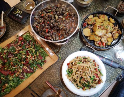 (烧汁小土豆) 这道菜是我最喜欢的一道菜,精爽的小土豆,相当的爽,配合这边特制的烧汁,口啤酒一块小土豆真的是很享受。 (花生米伴烧排骨) 摆盘就相当震撼的一道菜,因为特别的大,这边的肉也是相当大块的,...(烧汁小土豆) 这道菜是我最喜欢的一道菜,精爽的小土豆,相当的爽,配合这边特制的烧汁,口啤酒一块小土豆真的是很享受。 (花生米伴烧排骨) 摆盘就相当震撼的一道菜,因为特别的大,这边的肉也是相当大块的,每一块都比手机的长度要长,而且的话烧的比较的干,很也是很适合下啤酒的,宵夜必点的一道菜。 (炒粉) 这道菜有点像是潮州的果条,但是比起果条这边的更加的爽滑一点,是宵夜必不可少的主食。 (小田螺) 份量很多,性价比相当的高,小田螺在这边是比较的新鲜的,也是阳朔这边的特产。 (漓泉啤酒) 阳朔的本地啤酒,相当的好喝,有几个包装的,每一个包装的酒精浓度都有点不一样,推荐小胖瓶子的。 (小吃水果) 在这边的小吃跟水果都十分的新鲜,下酒很不错。 (服务) 谢大姐的服务还是一如既往的相当的好,天气比较寒冷,但是里面是比较温暖的,而且的话,上菜也十分的快捷,店铺的东西性价比都超级的高,无论是吃晚餐还是吃宵夜都很不错。