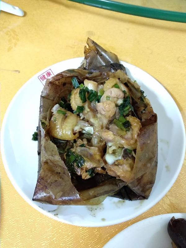 纸包鸡、纸包骨也是推荐菜之一,我们点的是纸包鸡,一份4小包,有些小失望,鸡选用的是新鲜鸡,肉质弹牙,但偏咸,小姐姐吃了点就放弃了。有兴趣的可以试试纸包骨!