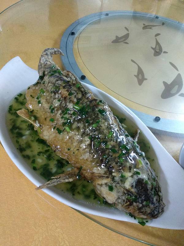每桌必点的葱油鱼,一条鱼大约3、4斤左右...下山已经接近中午,午饭时间也到了。