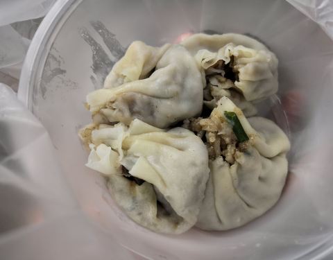 打包盒略简陋,4个烧麦一堆放就没有造型了,全部都挤压在了一起,吃的时候一个粘着一个