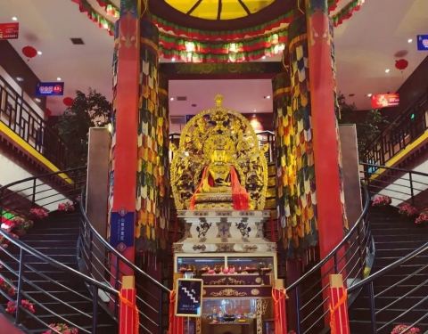 装修充满了浓郁的藏族风情,门口有一排转经筒,里面有个很大的金佛像,菜品也很丰富,藏族特色的牦牛...