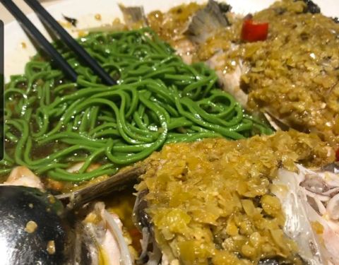 口味鱼头,招牌菜就是经典,鱼头性价比很高,鱼肉鲜嫩,剁椒很鲜美,鱼头入味,辣椒吃起来特别爽,搭配。鱼头菠菜面,两个人干掉了。绿豆浆,蔬菜汁和豆浆的结合,很不错。