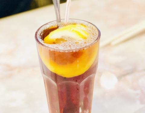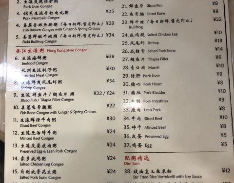 吃完汉堡吃冰淇淋然后又约了吃夜宵,不过胃口有限,就去看看吧。小伙伴是收藏小能手,我说啥? 在贵州路这里还有好吃的茶餐厅? 就靠近人广这里,没想到吃下来还挺不错,有点假装去HK了。 门开面不大,布置跟HK路过的小店差不多,中间小的圆台面,边上卡座,都非常局促的空间。还有一排只能1-2人的座位,把空间都利用足了,饭点时间估计点餐带走的比较多吧。 生滚粥为主,口味很多,还可以添加配料,超多选择,下面还有三丝米粉和肠粉等配粥精选的点心选择。意面序列就到41,可想而知。点了香江生滚及第粥,很大一份,目测2人吃点些点心足够了,里面猪肝大片,很嫩,粥的部分鲜香柔滑,有meatball还有猪内脏,挺地道的,特别是这个区域来说。 饮料点了冻柠茶,走冰,挤压一下柠檬会有酸味出来,会好喝一些,比较去腻。 南乳焖猪手,红腐乳烧的,之后看到店家放在三个大塑料盒里晾着,料的味道出来还挺香的,为啥朋友说有股肉桂的味道? 一只猪手对切,我的一半直接打包当第二天的午餐,看上去还不错的亚子。 原汁牛腩伴牛筋,一半一半,汁水很浓郁,喜欢里面的萝卜,很入味,牛腩部分也挺酥了。 白灼菜心,荤素搭配营养全面,菜茎和叶各一半~ 再来一份米饭,米饭倒是小贵6元一小塑料圆碗一份~ 总体来说人均不贵,地方不大,蛮有场景感,口味也不错,喝粥挺暖胃,天冷估计会多跑几次~过了晚上11点据说有饮料和粥品的优惠折扣,深夜食堂咯!
