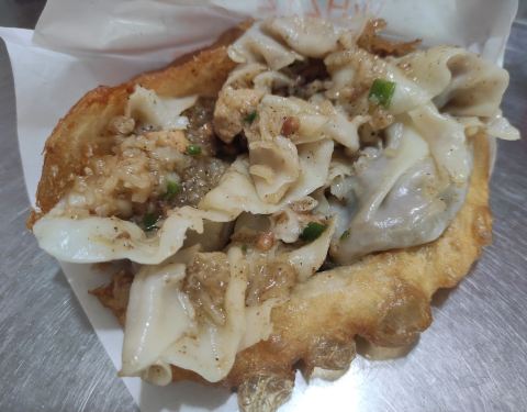 至于排了一个多小时的油饼包烧卖,个人不是那么墙裂推荐。烧卖吃不习惯,馅料水汤汤的,又有比较重的类似五香粉的味道,单吃烧麦引起了我味觉上的极度不适(可能是南北差异),包着油饼吃倒是舒适了许多。一个多小时的排队略显不值。