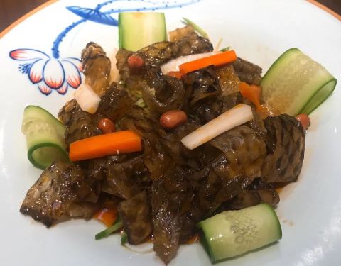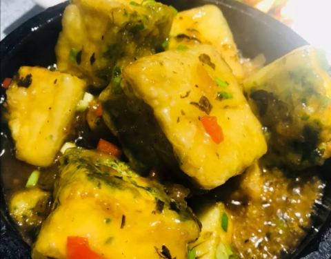 烤牛排,超级大的一盘,牛肉应该是先煮过的,外面烤的很酥脆,里面的汁水很足,外面裹着孜然和辣椒很好吃。 私房嫩豆腐,口味有一些清淡,配上特殊的浇汁,味道还行。 干锅茶树菇,味道很足,茶树菇很有嚼劲,好吃。