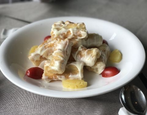 西北湖边,正好欣赏湖景,要是前几天下雪的时候肯定很美,不过那个时候不会想出门。话梅小排:酸甜适宜,开胃不错;水果油条虾:水果垫在油条虾下面,有菠萝和小番茄,感觉虾有点小,不过算新鲜了,趁热吃不错,冷了有点腻;鸭是朋友点的,我对这个一般般。服务很好很贴心,是个虚浮吃饭的好地方(✪▽✪)