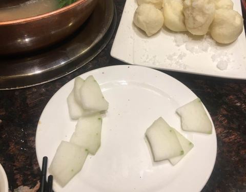 高钙羊肉口感嫩又韧,特别好吃,跟酸菜是绝配。雪绵豆沙是面皮,有点作假。