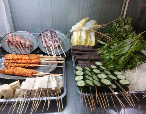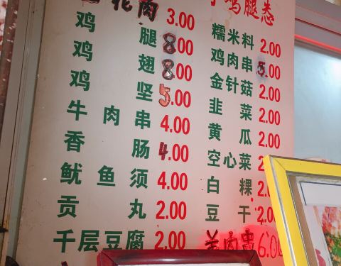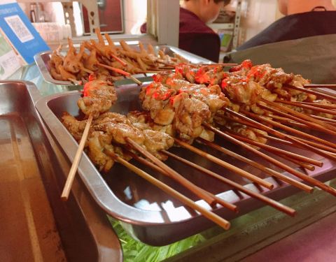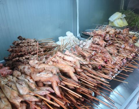 下午两点半到开始排队,可能由于五一假期的原因,人比较多,半个小时后排到点餐。东西并不多,鸡腿,鸡翅,韭菜,白菜,鱿鱼这些。然后又等一个小时取到烧烤。放花生酱的烧烤,之前没有吃过,有点甜,自己不是很喜欢,味道很一般,没有很好吃。不喜欢吃甜烧烤的可以不用尝试了。前后花了三个小时。