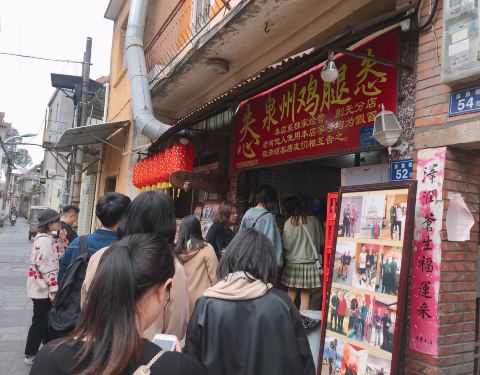 ∠( ᐛ 」∠)_ 去年国庆,排了1个多小时的队,还是未能吃到,这次终于攻入组织内部。 来到鸡腿怣,一定、务必将“耐心值”提到MAX,在这里,排队需要时间,付款需要时间,点餐需要时间,等餐需要时间,1小时12...∠( ᐛ 」∠)_ 去年国庆,排了1个多小时的队,还是未能吃到,这次终于攻入组织内部。 来到鸡腿怣,一定、务必将“耐心值”提到MAX,在这里,排队需要时间,付款需要时间,点餐需要时间,等餐需要时间,1小时12分,终于吃到了。 14:30营业,但其实14点已开始运营,创业于1994年,口碑已在25年里得到了认可。隐匿在小巷里,人气却依然爆棚。不盲目于开分店,认真经营着小店,把控着味道。 炭火的魅力在此登峰造极,慢烤使得炭火的香气攻占食物的每寸土地。「米血糕」,2元,超级超级好吃,软软糯糯;「金针菇」,2元,也一定不要错过,新鲜脆甜;「鸡翅」,8元,心无旁骛地去撕咬吧;「鸡爪」,5元,第一次在烧烤届尝试鸡爪;「鸡胗」,5元,咬合一大考验,虽然好吃,但嚼得有点累,下次还是放弃吧。 对了,花生酱再加1元,很喜欢他家花生酱的口感,浓郁且不腻。 墙上小纸条写到,“等了好久,好吃的话,那就原谅他吧”,不知道这位吃友是否原谅,但我俩已在期盼着下次。