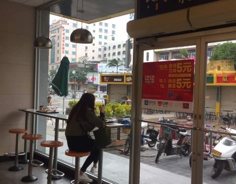 麦当劳门店的双12氛围很浓,大幅易拉宝宣传活动。麦辣鸡腿堡是麦当劳的经典产品,酥酥的辣味好过瘾,5元的单价更实惠。