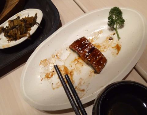 点的烧肥牛铁板饭,火山拉面,还有烤鳗鱼,个人觉得火山拉面一点不辣,肥牛铁板饭特别好吃!烤鳗鱼一般,太甜了,而且鱼肉少,肥,吃着基本都是鱼皮,一共就4块38元,太贵了。不推荐,个人觉得铁板肥牛饭最好吃!