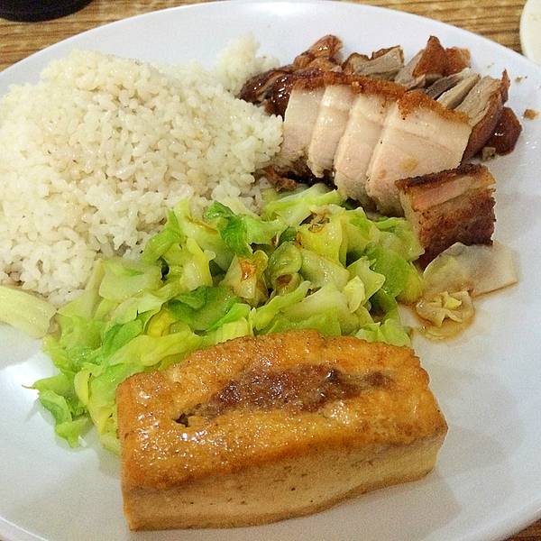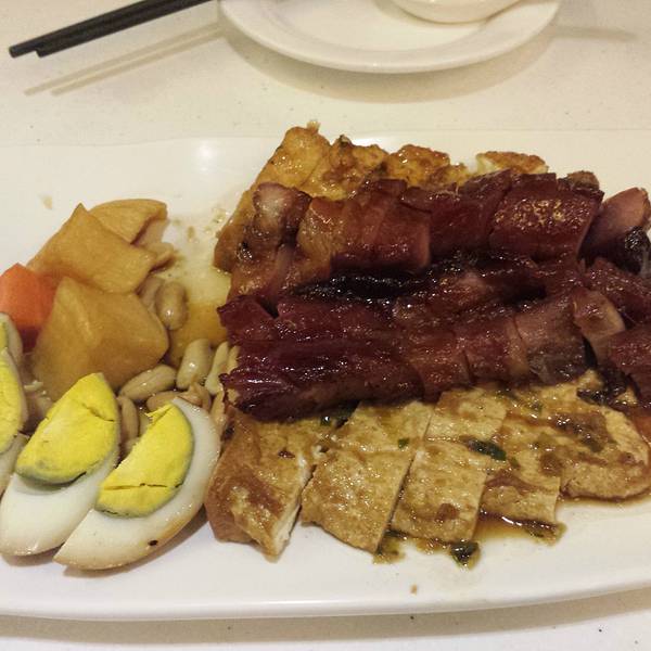 大盘子装饭菜,普通的白饭浇上汤汁,普通的大白菜,吃起来甜甜的,还算清口,区别在于肉。腊味的是腊肠和腊肉,分量很足。口味正宗。5分。尝了一块牛腩,炖的略略不太烂,而且口重。不过老板娘说今天第一天推出,口味还在调整中,还特意询问了我们的意见,服务态度很好。喜欢吃烧鸭和叉烧肉的朋友不要错过呀!这家的有些卤味一定要早去买,晚了就没啦。这里的服务不会让进来的每个客人失望,都是彬彬有礼的对待来的每一个客人,这般的服务相信来过的人也深深体会到了,使人感觉很舒服。