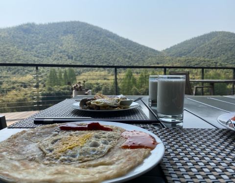 早餐很一般,水果光盘了一直不补。咖啡很涩很难喝。果汁只有胡萝卜,连基本的橙汁都没有。不过煎饼当有必品阁的王饺子,这个要点赞。另外景色不错,可以在平台上吃饭。