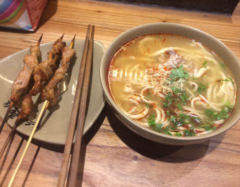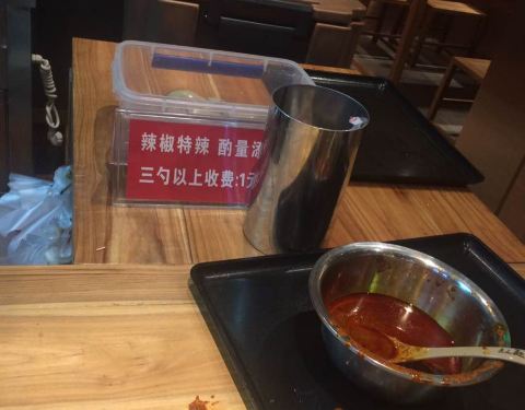 还是老味道。标配拉面加肉串。辣椒过瘾,这么大的三勺辣椒得多辣!