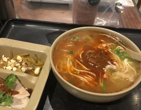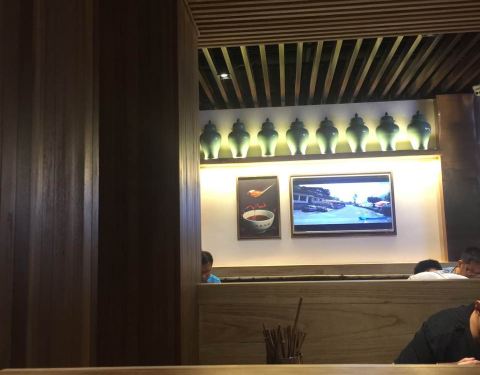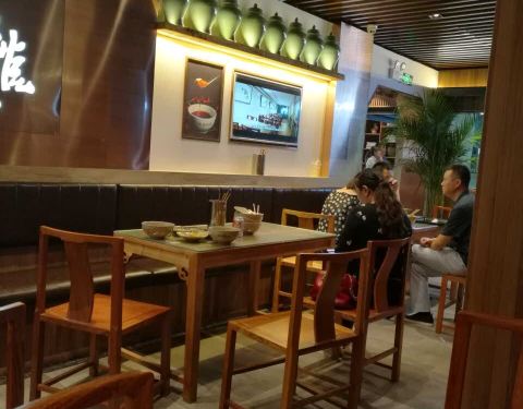 该餐厅的特色是肘汤拉面跟肉丝炒面,辣椒酱也挺香的,哨子面也不错。这里还算可以,虽然价格这两年频频在张,但还是可以接受的范围内。一直比较钟爱肘汤面,但汤不如以前浓了。肉片炖的非常的烂,粉条吃起来软软烂烂的,但是很有劲道;而且荤素搭配的非常的合理,营养均衡。里面有搭配一些肉片、姜片之类的,是把这些准备好的材料和粉条一起下锅炖的,而且里面也有加入麻油,味道非常的香。特色菜很多,有水煮鱼、沸腾虾、夫妻肺片、口水鸡、糍粑、河水豆花等等。味美量足,值得品尝。餐厅布置的中规中举,大厅宽敞,桌椅摆放的很整齐,柔