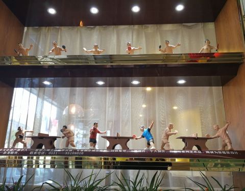 玉泉森信大酒店,近泉城广场,与山东省科技馆斜相对,是全国第一家乒乓球主题宾馆。一楼有个乒乓主题小展厅,对乒乓球感兴趣的朋友可以一看。中餐厅各色海鲜炒菜味道不错。服务员态度和蔼。很好。