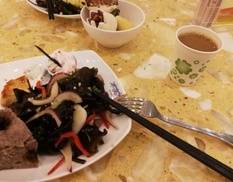 为了赶时间去泰山游玩,早上急急忙忙的去吃了早餐,有糕点,水果,蔬菜馒头,包子,炖肉,还有咖啡,茶水和豆浆,典型的中式快餐厅的感觉。