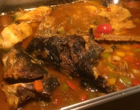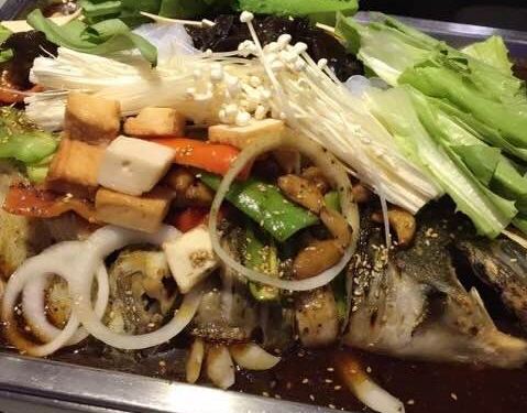 我们到了店里,服务人员安排我们落坐后,带我们其中一人去选鱼。这里主要的卖点就是鱼是活鱼现杀现烤的,可以亲自选一条鲜活的鱼,然后厨师们会以最快的速度杀,洗,烤,加料整个过程也就15分钟左右吧。刚烤出来的鱼肉质很鲜嫩,美中不足的是鱼肉吃不出滋味,通过边吃边加热,慢慢就会越来越入味,这时,会有不时有服务员来给加汤,汤是咸的,以至于我们吃到最后是越来越咸。