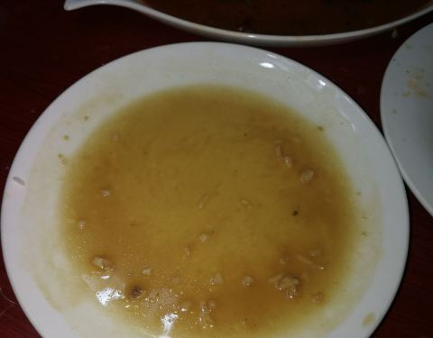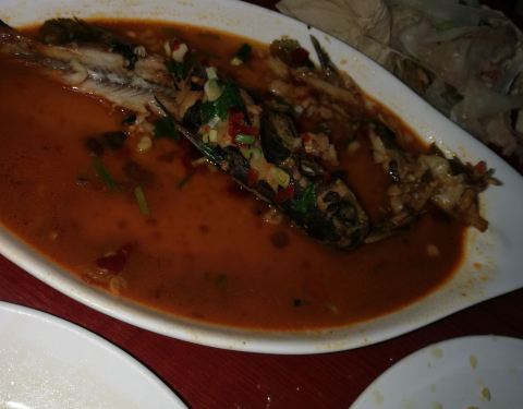 到莱西产芝水库游览,中午饭 查到一家做鱼老店,过来点了鲢鱼头汤,红烧嘎鱼,一盘木耳菜,一盘鱼皮拌黄瓜,一尝果然名不虚传,无论从环境卫生,做工口感都属一流,价格也公道,所以强烈推荐这家老店!下图是我们两个人吃剩的场面。