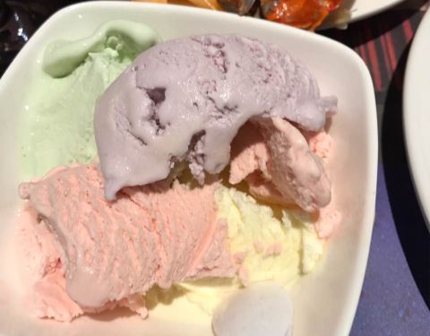 去四海一家吃自助餐不要去太晚,不然有些食物会出现空缺,时间太晚的话也不会再重新做,然而就是尝不到美味的餐饮了。当时吃到了最后仅剩的两块牛排,味道也是棒棒哒忍不住想再来几块的冲动。里面有哈根达斯无限量供应,排一次堆只能领一个,为了吃一个球排半天队也是够了。三文鱼也比较新鲜,最爱的芝士蛋糕最后一大个被我全部端走了,直接忽略了身后妹妹恨恨的表情,蟹棒和虾不知道上了多少盘,好吃到不想停下来,四海一家碰到我们这种吃货可能会崩溃吧。