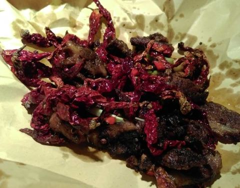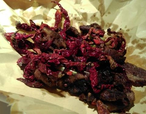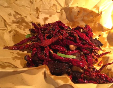 - 每次来都会点这个纸包牛肉,属于麻辣口味,吃的时候要小心花椒。这次吃得很满意