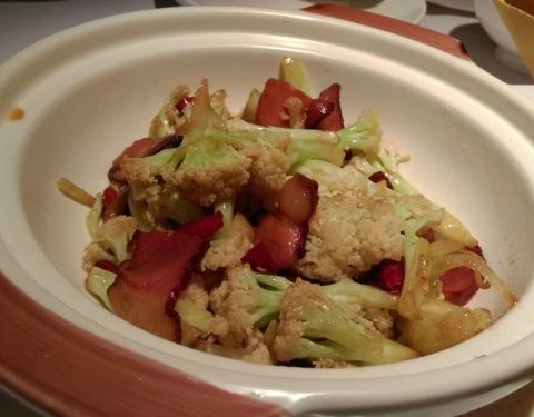 每次来都会点这个纸包牛肉,属于麻辣口味,吃的时候要小心花椒。这个菜从以前60多吃到现在78元的价格。腊肉有机花菜味道很好,价格也美丽,菜系偏咸,点了这个五色菜中和一下。这次吃得很满意。