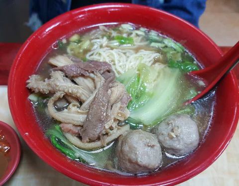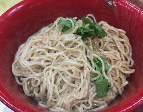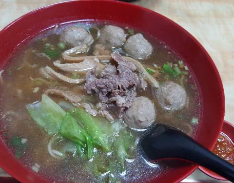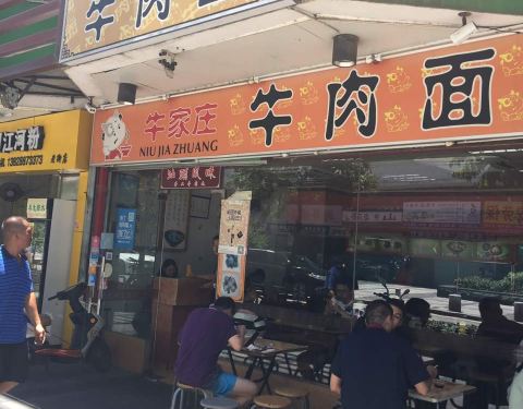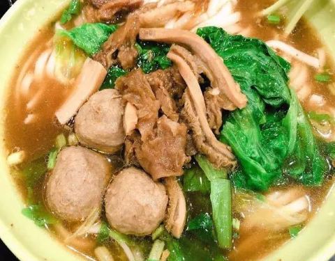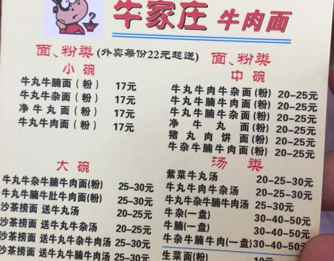 店面不大,主打潮汕风味,店内店外都有座位,生意好的时候店外的露天位甚至会扩张到隔壁店铺前,你可以选择面、粉、或汤,浇头的内容基本就是牛丸、牛杂、牛肉、牛腩、牛筋的排列组合,其中紧实弹牙的牛丸较受欢迎。 他家的口味偏咸,在店内最里面是厨房窗口,窗口前有酱料坛,坛子里是沙茶酱、辣椒酱,你可以自由调配自己喜欢的口味。如果想吃干面,可以点沙茶捞面,即沙茶酱拌面,吃起来满口都是花生香,但有点甜,配好汤正好解腻。