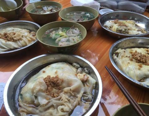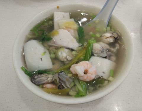 - 味道尝尝还好,肠粉老是吃不来喜欢的感觉,应该还好吧。海鲜杂汤主要就是海蛎、去壳的虾、鱼片等