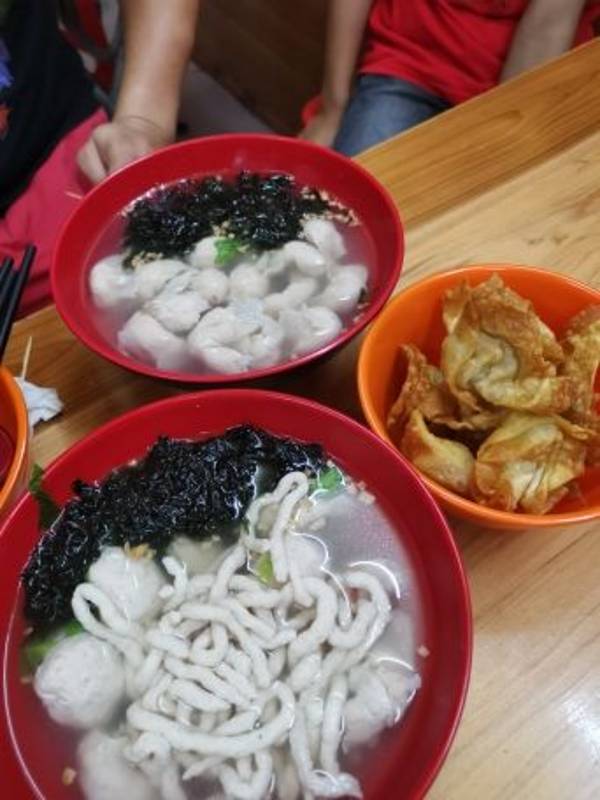 鱼饺很有弹性,汤就是清汤底,加点葱、盐、胡椒等现场调制,配起来很鲜美,味道独特。还有炸云吞、炒粉、炒面吃,生意比较火。