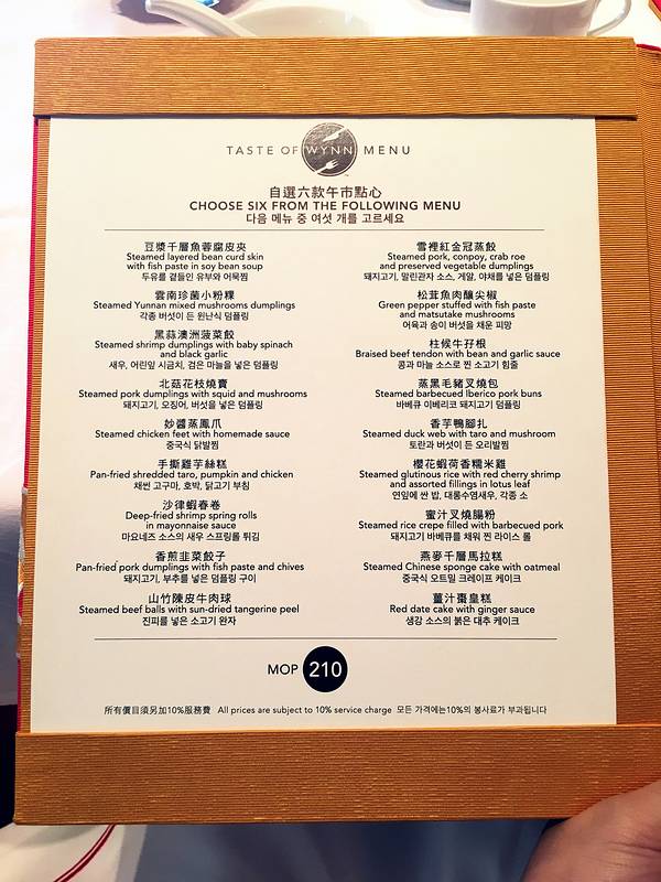 星级的用餐环境和服务。早茶提供报纸阅读,更有长期推广的MOP210(加一服务费)任选六款招牌点心优惠套餐,值得尝试的包括有青芥甜虾长春卷和豆浆千层腐皮夹。好茶者必试永利特色茶,由玫瑰、寿眉、白牡丹、香片和荔枝红组成,留香持久。