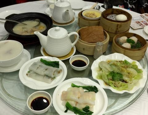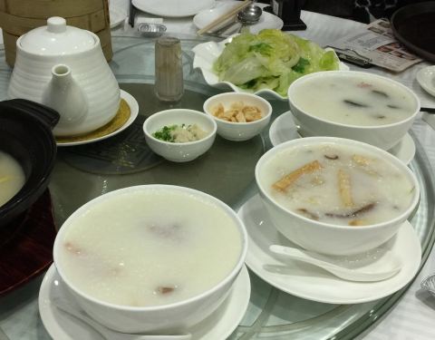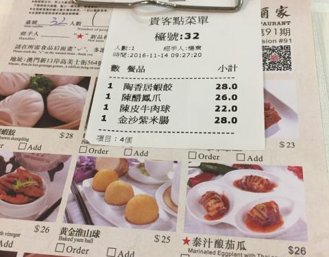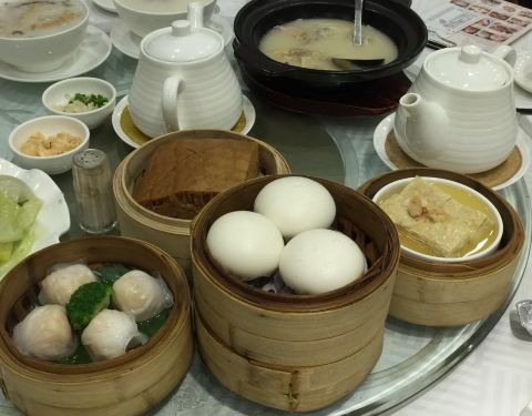 同事推荐的澳门实惠就餐去处。查下地图离金沙酒店不远,于是坐所住威尼斯人酒店的免费车到金沙,然后经过盛世莲花,广场后面那条街就是高美士街了,一个右转就能看到陶香居了。 上楼发现殿堂很大而且时刻很多,很兴旺的感觉。点了陶香居虾饺、流沙包、两种肠粉、三种粥、云吞鸡等,满满的一桌子。打算各种东西六个人都可以两两分分都尝到味道。另外还点了一壶铁观音。 东西上来的稍有些慢,可能是客人太多的缘故吧,东西的味道虽没有什么惊艳,但也无不满意之处。当然最令人满意的还是性价比。