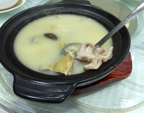 环境不错,店里就是一排凳子,是等位用的,都是一些港式的出品,算是比较传统的茶楼,服务挺热情的,都是用的粤语交流,虾饺,烧麦都是非常饱满,吃虾都吃不少,墨鱼饼这个真不错,外面炸得外脆里嫩,里面放入芝士,酸甜的酱汁很好吃,流沙包皮是浅绿色的,跟平常的不一样,撕开,咸蛋黄都迫不及待流出来了,汤是招牌,有鱼翅,鸡肉,味道浓郁,真材实料。
