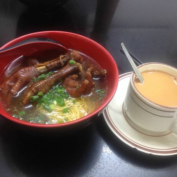 因为前一天晚上快2点睡。所以我们睡懒觉,出发时间已是11点,不过早餐没去檀香山咖啡,去了旁边的茶餐厅。但我名字忘了··· 在广东吃面,最多就是云吞面,虾子面,牛腩面,瘦肉面等。很少遇到鸡脚面。 所以早上点了一个鸡脚面套餐。就是鸡脚面+热奶茶 36MOP. 酱油鸡脚和碱水面,其实味道很Match,一杯热奶茶醒神。这就是港澳人士习惯的早餐配搭。