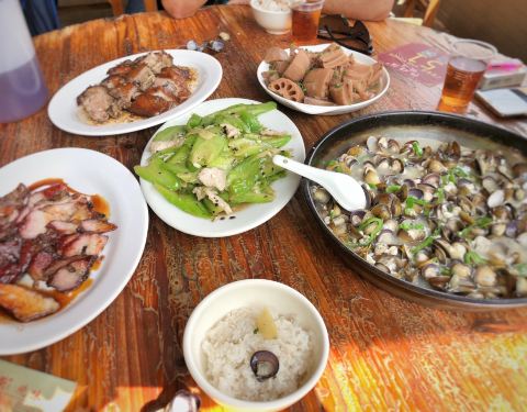 距离金台寺5公里的大赤坎村驰名的烧味海鲜餐厅~跟着导航走挺好找的,餐厅前有个篮球场,11点半到,没有停车位了,不过餐厅里面有很多位置啦,桌子挺多的,目测50多桌~好多人去打包,到了1点就真的要等位了,而且好多烧味都卖完呢~叉烧真的真的好吃,但是有些很肥~排骨太干不够味~罗氏虾真的必点,55一斤,有糕有虾籽太棒了~烧鸡,真绝了,可以做得跟烧鸭一个味,皮也是烧得像烧鸭皮一样的口感~腐乳炒通菜,中规中矩,太多汤汁了,不够干~环境服务也一般啦,喝茶装饭都是自助的,2人一茶饭位~