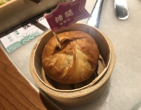 黑松露牛肝菌牛蛙,有松露独特香气,牛蛙嫩,也入味。 糖腿破酥包,用云腿做的糕点,这个好吃