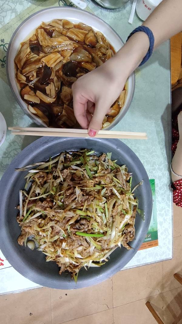 仔细琢磨琢磨,盘子虽然大,但官烧三样铺了薄薄的一层,烤羊肉大部分都是葱。看似忠厚老实,结果小心思挺多嘛。