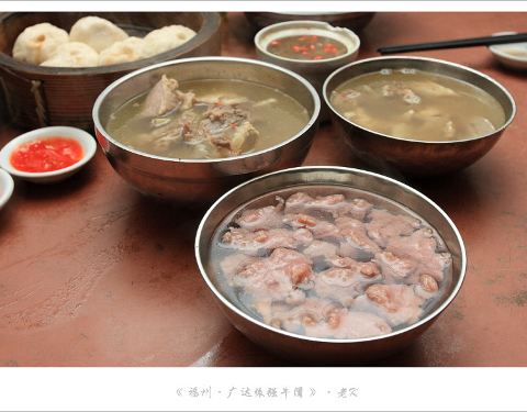 做为福州的传统特色小吃,达道武仔牛滑店和广达依强牛滑店是不能不提的。就目前来看,感觉达道武仔发展的很快,已经开了多家分店。不过,在福州当地人眼中,对广达依强牛滑店还是情有独钟. 小时候就在台江区长大,依强牛滑店是我常来的地方。要上一罐牛滑,一笼小笼包,吃的是津津有味。 这么多年了,依强牛滑店还是没有什么变化,按照北京人的标准就是脏乱差,不过,当美味展现在眼前的时候,一切都变得不重要了。 牛杂炖的火候很不错,有嚼劲却不费牙口,让我很喜欢。 牛滑,这个太熟悉了,从小就喜欢吃这口,柔软的口感永生难忘,可惜在北京还没有吃到过,绝对的一个字:赞! 牛排,依强牛滑店的招牌小吃,口感和味道都是超级无敌,而且牛排的肉质也很不错,真是美味。 拌牛肚,哈哈,我小时候最喜欢吃滴,练牙口,也练肠胃。虽然没有老北京的那种芝麻酱提香,却也是经典中的经典,忘不了! 拌百叶,这个比牛肚嫩些,味道和拌牛肚差不多,好吃。 拌脚筋,一直喜欢吃牛蹄筋,有嚼头还不增肥,口感也非常不错。 牛鞭罐。自打过了18岁,我就开始吃牛鞭罐了,据传说是吃哪儿补哪儿哈,一直吃到现在。。。餐具破的已经不能再破,不过味道超绝,里面的干货不少,强烈推荐! 牛鞭罐的汤底带着浓浓的中药味儿,食材并没有因为长时间炖煮而变得发软变烂,货真价实,超赞! 故味难寻,用人生去体会传说中的味道。。。
