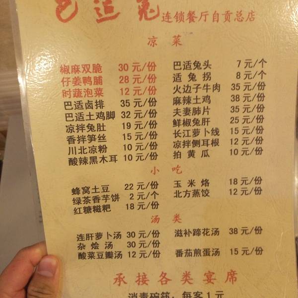 传说,中国的兔子一半是被四川人吃的。四川的兔子一半是被自贡人吃的。一点不假,自贡人民对兔肉的喜爱甚过于山珍海味。你只要去自贡的中餐馆,可以说没有哪一家是不会做兔肉的。今天我向大家推荐的这家巴适兔餐厅就是自贡味道较好的正统餐厅。 巴适兔位于自贡大安区杨家冲一带。朋友们可以乘坐32路,1路,38路车到天然居车站下车。步行50米即是巴适兔的门店。也可以打车前往,司机都知道的。起步价5元出租。巴适兔主营鲜锅兔肉、烤兔(过年时候有烤兔、其余时间没有)。泡椒牛肉丝,凉拌肥肠,夫妻肺片,鲜嫩河鱼,红油百叶,肥肠烧芋头,豆子烧鹅,甜品有玉米烙和蜂窝土豆等等。饮品值得推荐的就是鲜榨花生豆浆,味道纯正新鲜。一扎花生豆浆是18元。该店的鲜锅兔分大小锅,小锅48元。大锅约68元。啤酒8-12元一瓶。主要的荤菜大约32-38元,素菜12-16元左右。凉拌菜35左右,荤菜汤类约30元,素菜汤类15元左右。甜品16-20元左右一份。 该店的面积为2家门面,合计约120m2.分为热菜间,凉菜间,小吃制作间,包间4个。大堂大小桌子约20多桌。基本上饭点的时候,这家分店满座状态。最关键的是味道很好,价格中等。2-3人用餐价格约120元左右。10人用餐价格在400元左右。人均30-45元一人。我们4月2日中午用餐14个菜,费用是411元。索要发票还中了5元。自贡地区发票最高奖励5万元。大家感兴趣的可以参与一下。 店内环境只能说中等,有无线网络,不过很难连接上。最忙的时候服务人员有可能服务不到位。上菜的速度还是很不错的。基本上能满足客人吃饭的需求吧。特别推荐的就是鲜锅兔,夫妻肺片,花生豆浆,鲜嫩河鱼。这家店在自贡生意和口碑都还是很不错的。大家有机会去品尝一下吧。