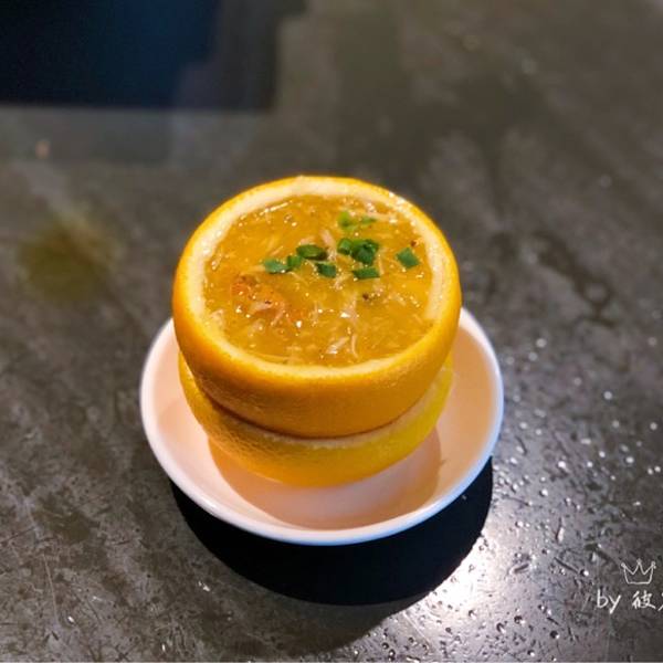 蟹粉蒸蛋,盛器是一只掏空的橙子,里面有鸡蛋还有蟹粉在上面,透着点水果橙香。