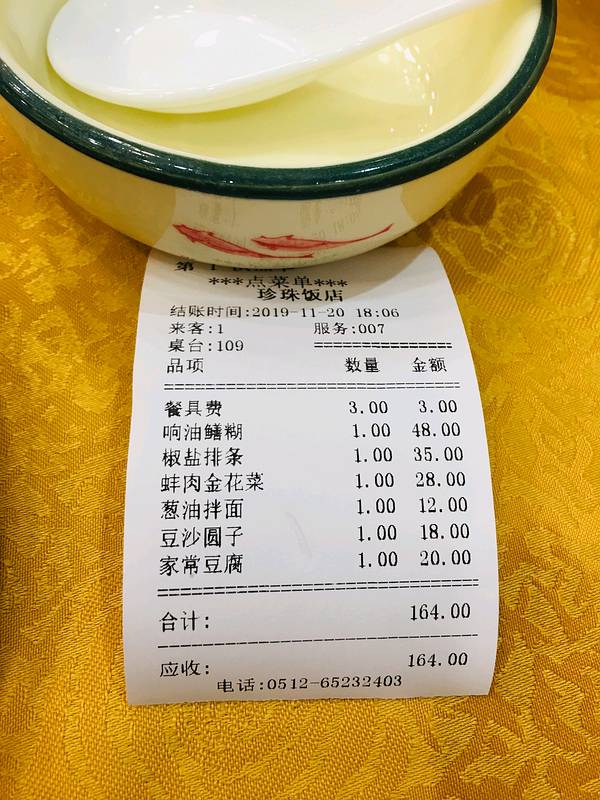 - 黄酒一瓶,飞哥居然自己都喝 了~珍珠饭店,也是苏州的老牌饭店了吧。价格还是很实惠的